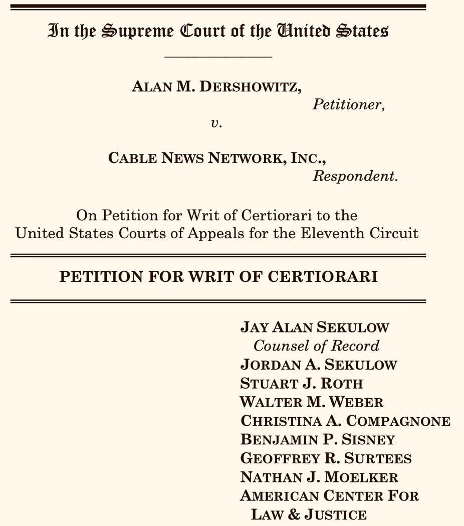 Mindful of that spirited quote, consider the following recent statement by Jay Sekulow, attorney for the professor in Dershowitz v. Cable News Network (cert. petition, 2026):