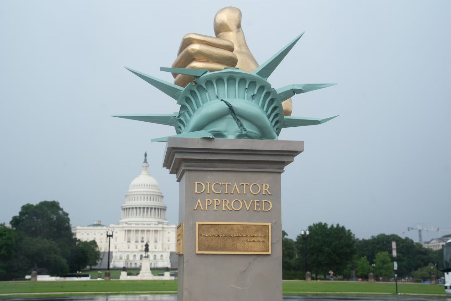 The artwork’s creators intended “Dictator Approved” as a rejoinder to the June 14 military parade and authoritarianism, according to a permit issued by the National Park Service. The parade, the creators wrote in the application, “[w]ill feature imagery similar to autocratic, oppressive regimes, i.e., N. Korea, Russia, and China, marching through DC.” The purpose of the statue, they continued, is to call attention to “the praising these types of oppressive leaders have given Donald Trump.”
